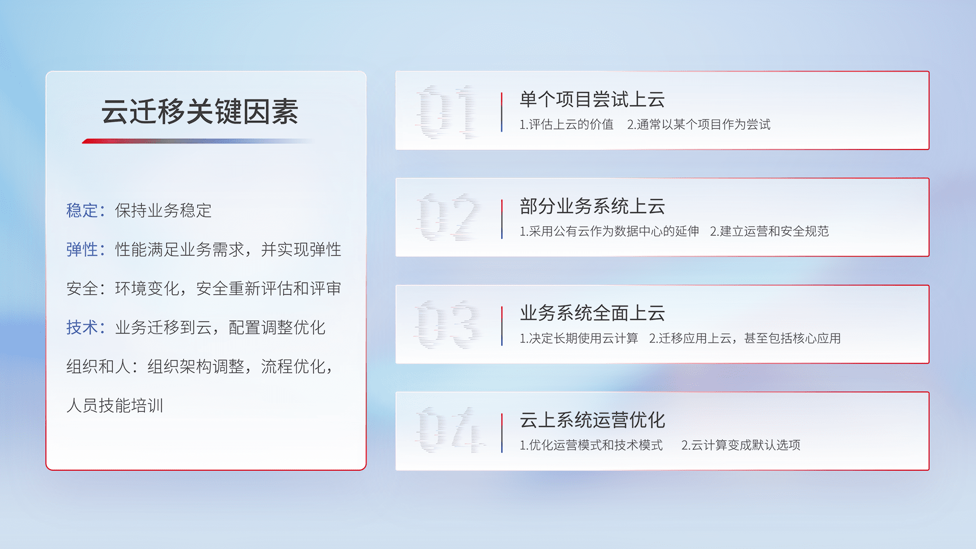 结合实际业务,,,从规划设计、、、云平台选型、、、云原生改造、、、数据迁移、、集成交付,,迁移全过程为客户识别最佳上云路径,,,做好风险识别管理,,设计网络架构、、、身份权限、、、安全审计合规、、、、操作审计、、、、日志审计、、、、监控告警策略、、多站点容灾设计等,,对云上基础设施进行整体规划,,,,提升IT治理水平,,以满足弹性、、、、高可用、、、、高性能的需求。。。。