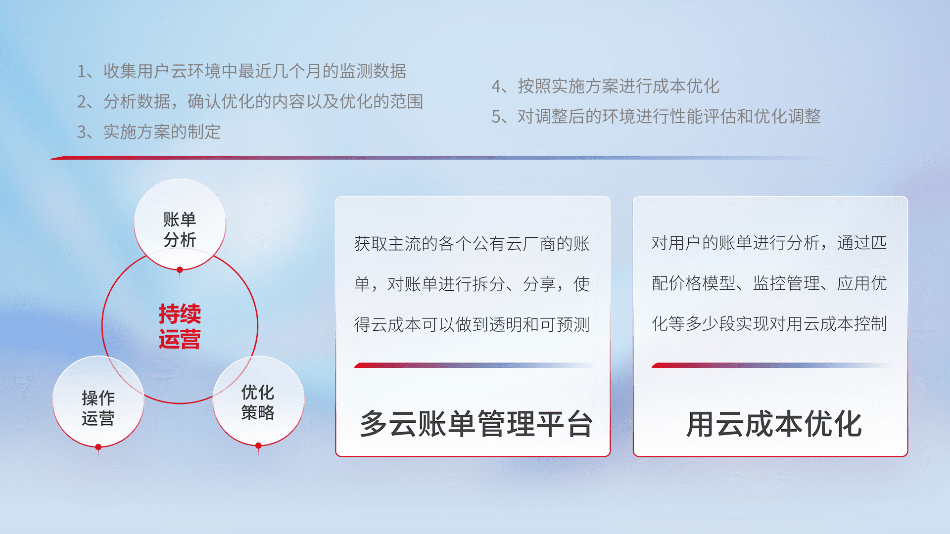 通过多云纳管,,,,以统一的资源数据模型把客户的云资源进行抽象和封装,,进而实现对多云资源的统一操作,,,保障云资源管理的可靠性、、稳定性与可用性。。。量身定制化运维内容,,,配置、、、开发运维、、、、补丁管理、、、备份、、、监控、、、认证和访问管理、、、审计和日常巡检等,,保障在用云过程中的可靠度,,稳定度以及高可用率。。